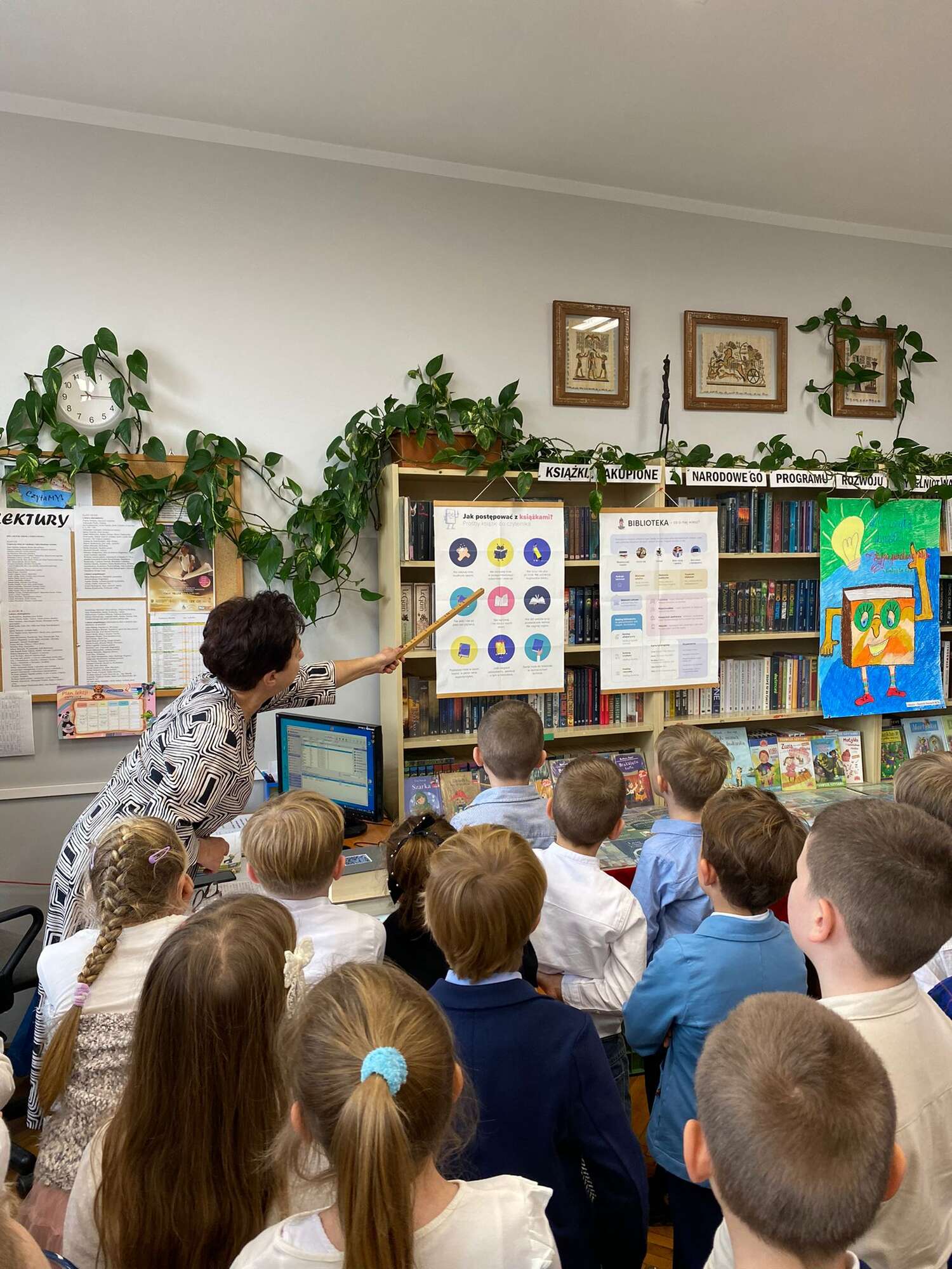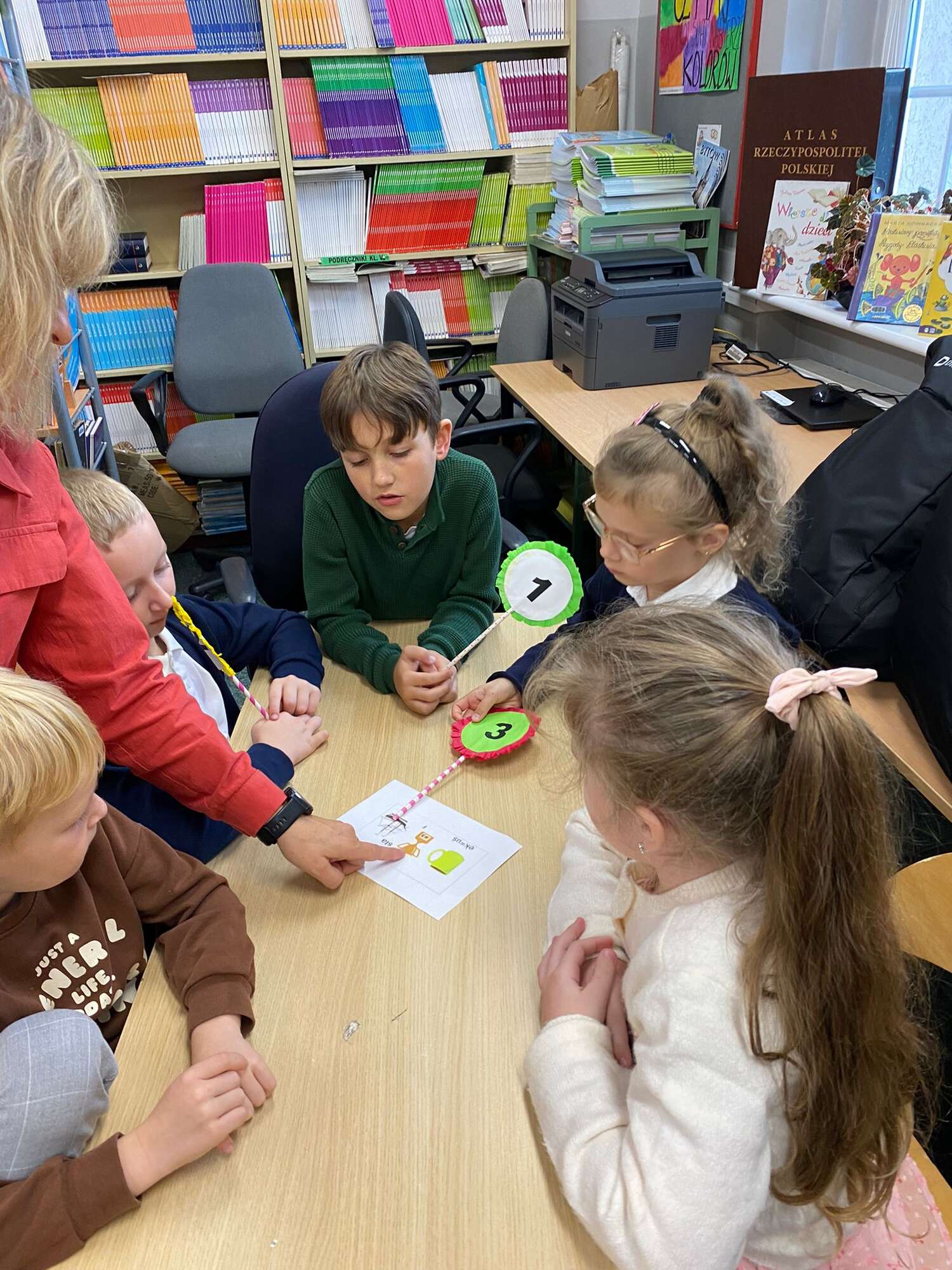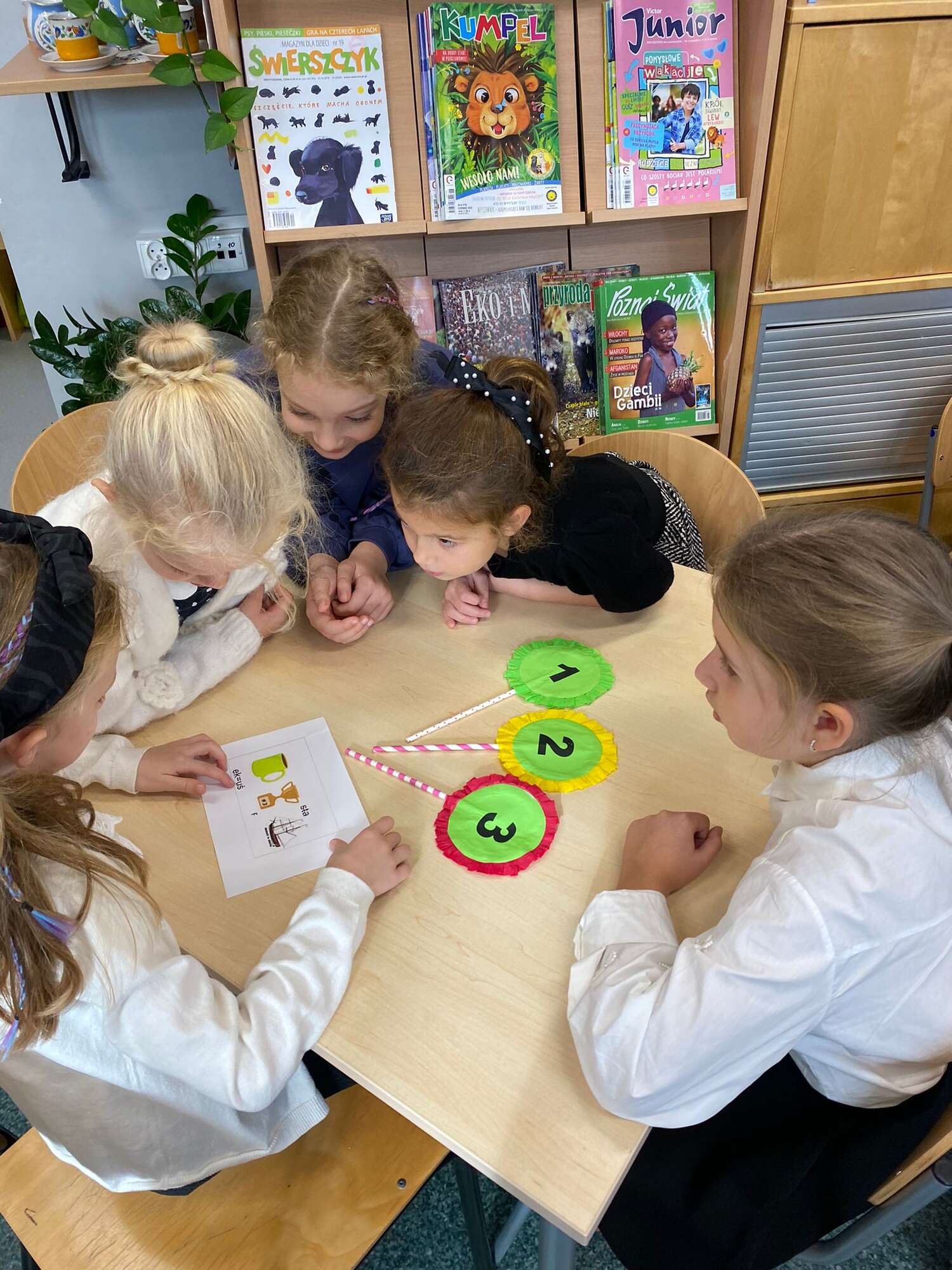 Uczniowie klasy I odgadywali także bajkowe zagadki oraz tytuły książek po okładce, rozwiązywali rebusy, które sprawdziły ich znajomość bohaterów baśni i bajek. Z zainteresowaniem obejrzeli film pt. "Jak powstaje książka?”.