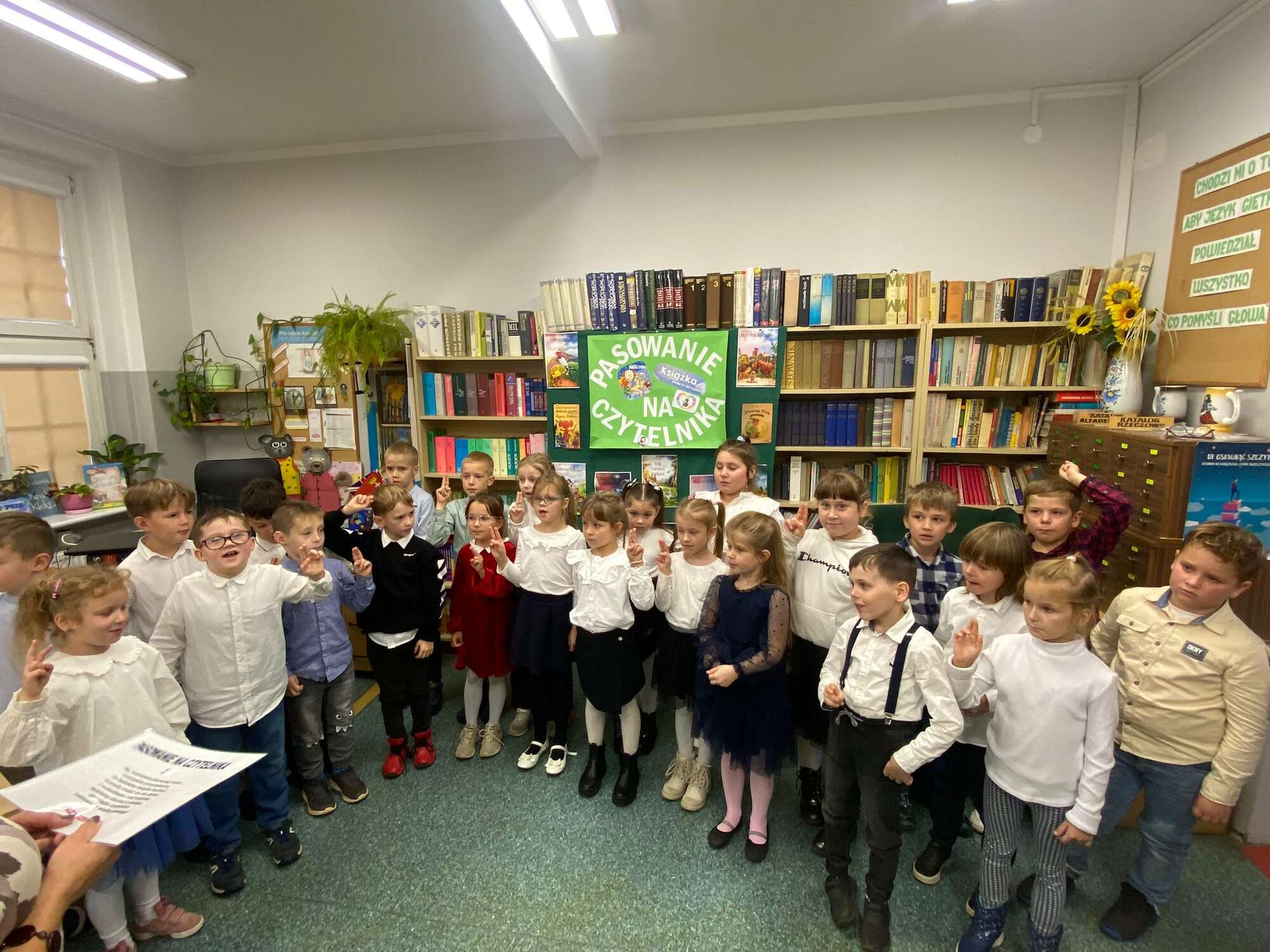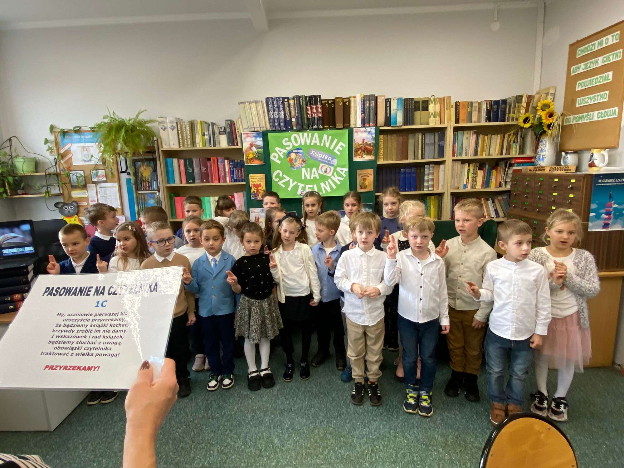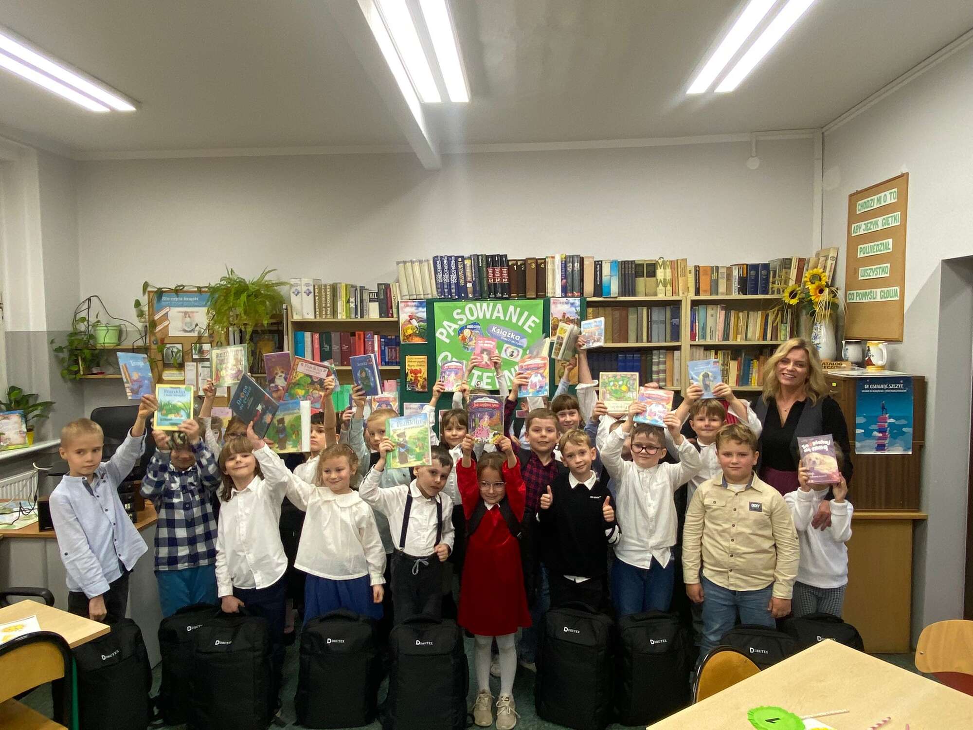 Po takim wprowadzeniu przyszli czytelnicy złożyli uroczyste przyrzeczenie, że zawsze będą książki kochać i szanować. Po pasowaniu każdy uczeń samodzielnie wypożyczył książkę i otrzymał na pamiątkę plecak z wyposażeniem od FIRMY DRUTEX.