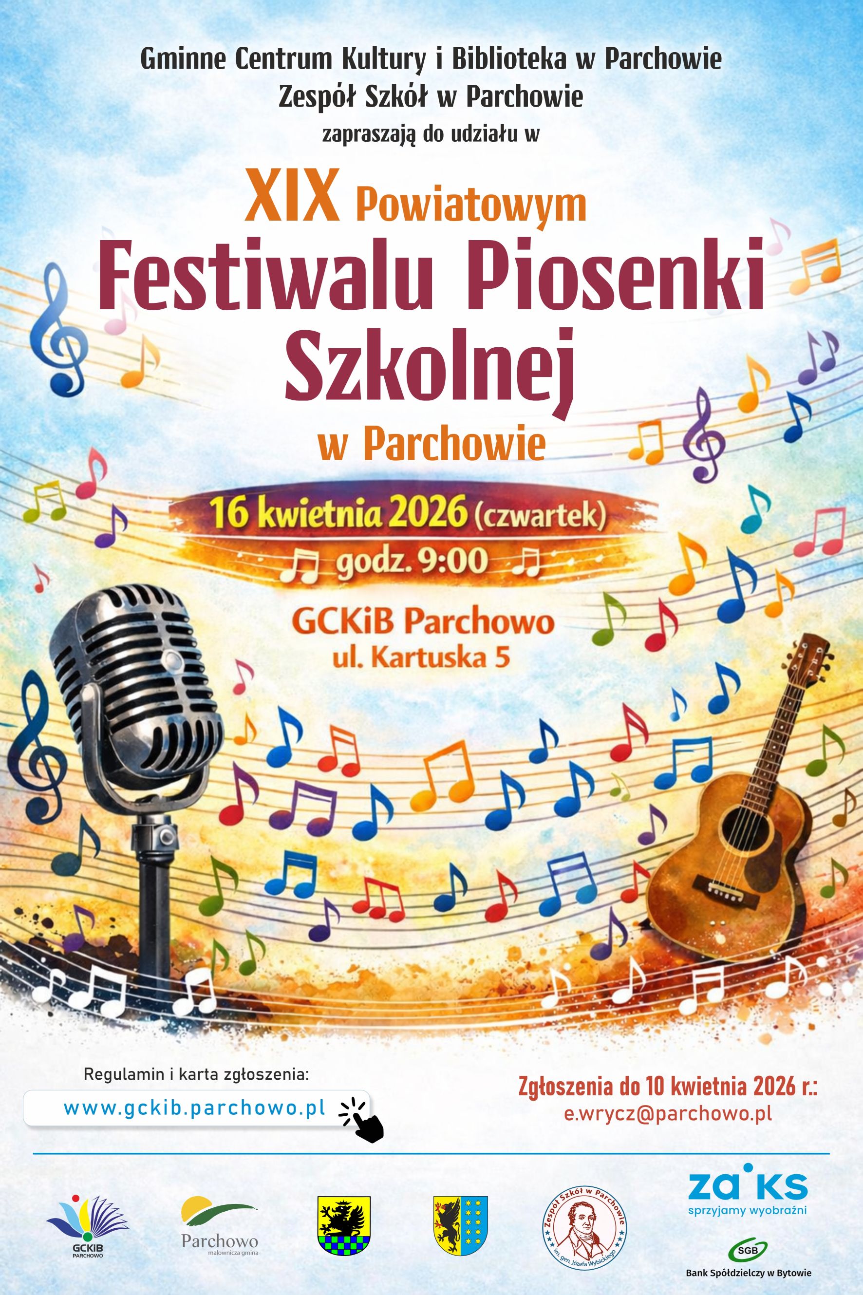 Gminne Centrum Kultury i Biblioteka w Parchowie zaprasza serdecznie wszystkich chętnych do udziału w XIX Festiwalu Piosenki Szkolnej.
