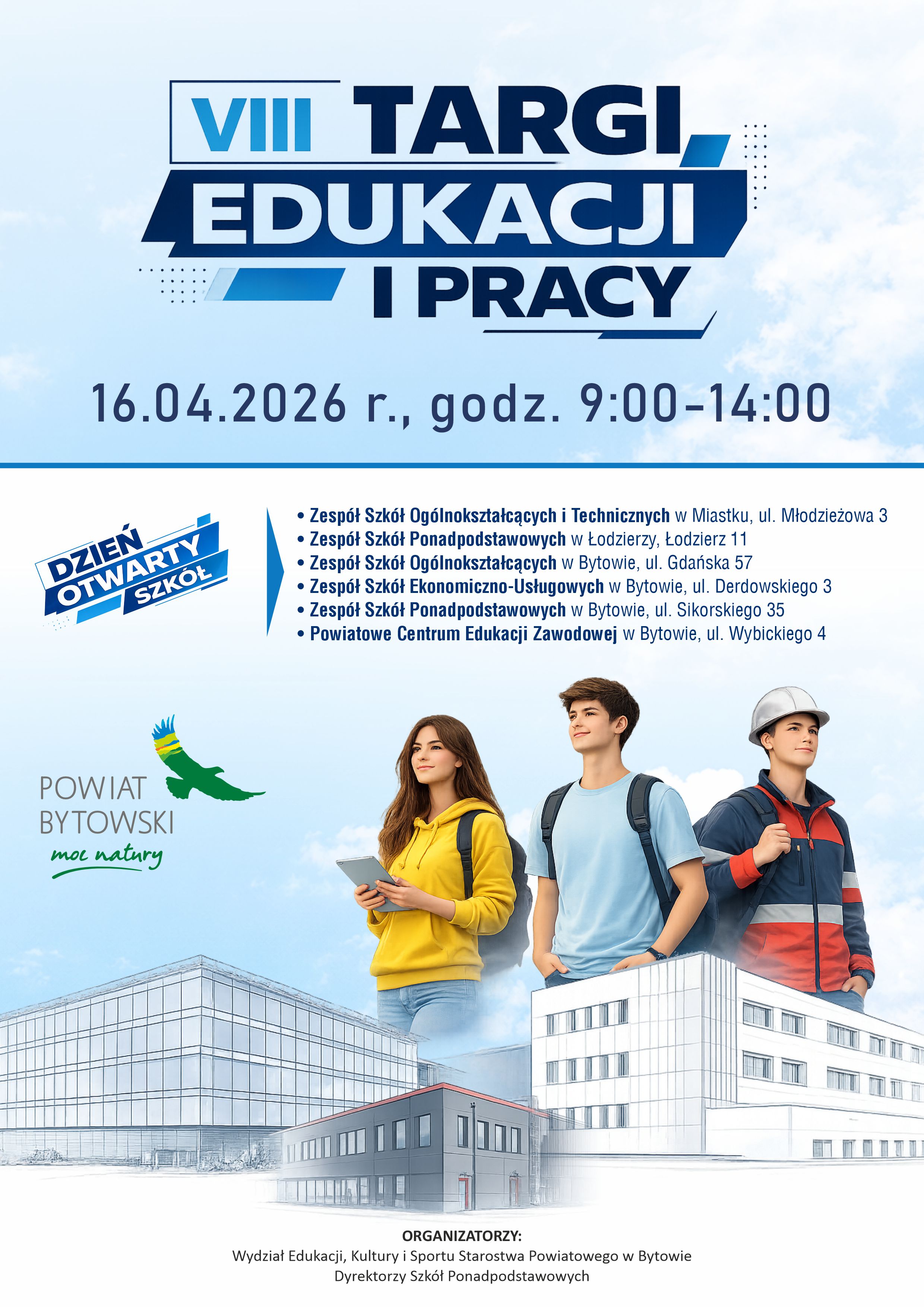 Wydział Edukacji, Kultury i Sportu Starostwa Bytowskiego oraz Dyrektorzy Szkół Ponadpodstawowych zapraszają na VIII Targi Edukacji i Pracy.
